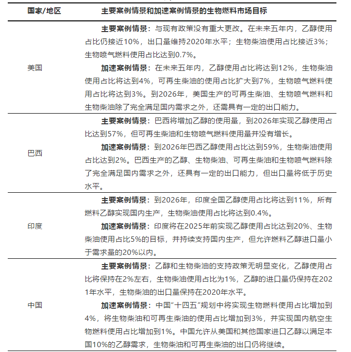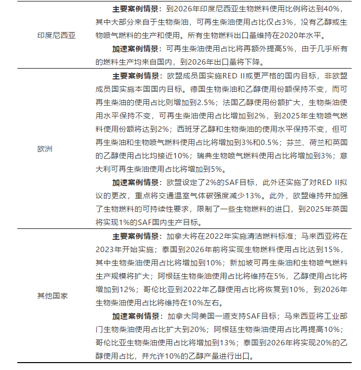 主要案例情景:加拿大將在2022年實施清潔燃料標(biāo)準(zhǔn);馬來西亞將在2023年開始實施;泰國到2026年前將實現(xiàn)生物燃料使用占比達(dá)到15%,其中生物柴油使用占比將增加到10%;新加坡可再生柴油和生物噴氣燃料生產(chǎn)規(guī)模將擴大;阿根廷生物柴油使用占比將維持在5%,乙醇使用占比將增加到12%;哥倫比亞到2022年乙醇使用占比將恢復(fù)到10%,到2026年生物柴油使用占比將維持在10%左右。