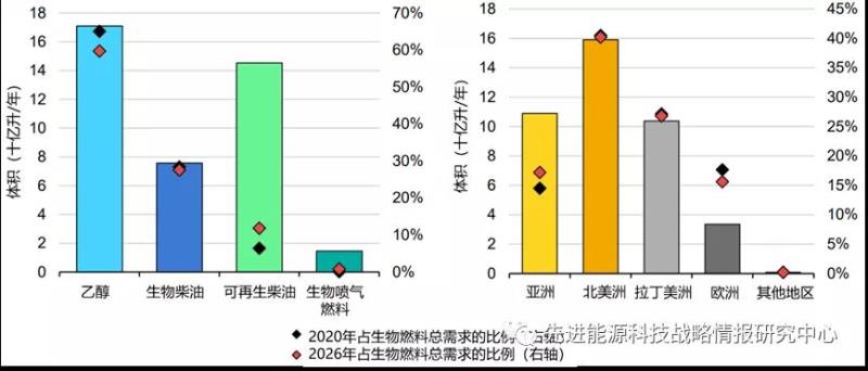 圖5 2021-2026年不同種類(左)和不同地區(qū)(右)生物燃料需求增長預(yù)測