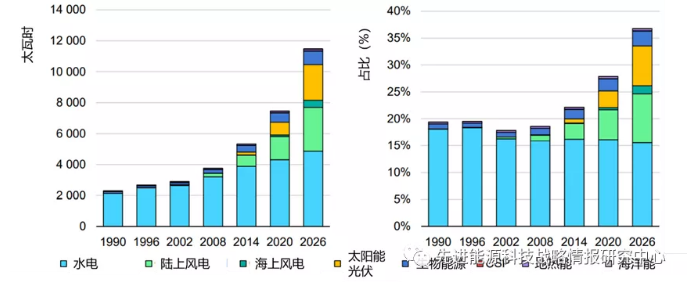 圖4 至2026年不同可再生能源技術(shù)發(fā)電量及占比預(yù)測