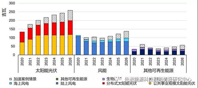圖3 至2026年主要案例情景和加速案例情景中太陽能光伏、風(fēng)能和其他可再生能源年度新增裝機規(guī)模預(yù)測