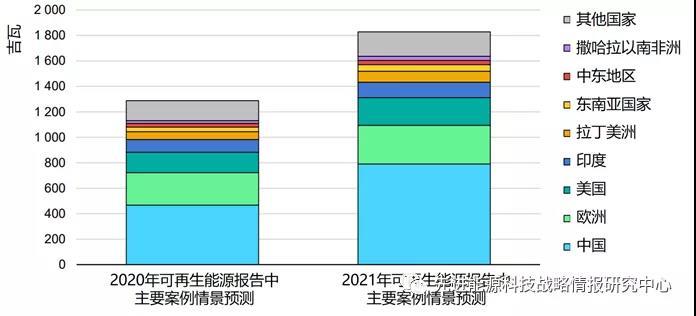 圖2 2020和2021年報告主要案例情景對未來五年不同國家/地區(qū)可再生電力裝機容量預(yù)測