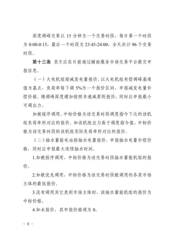 深度調(diào)峰交易方式為“日前報(bào)價(jià),按需調(diào)用,按序調(diào)用”。深度調(diào)峰交易以15分鐘為一個(gè)交易時(shí)段,每日第一個(gè)時(shí)段為0:00-0:15,最后一個(gè)時(shí)段為23:45-24:00,全天共計(jì)96個(gè)交易時(shí)段。