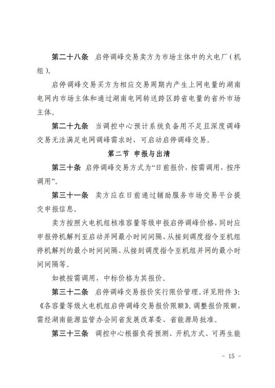 啟停調(diào)峰交易賣方為市場主體中的火電廠(機(jī)組)。啟停調(diào)峰交易買方為相應(yīng)交易周期內(nèi)產(chǎn)生上網(wǎng)電量的湖南電網(wǎng)內(nèi)市場主體和通過湖南電網(wǎng)轉(zhuǎn)送跨區(qū)跨省電量的省外市場主體。