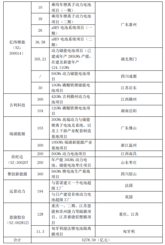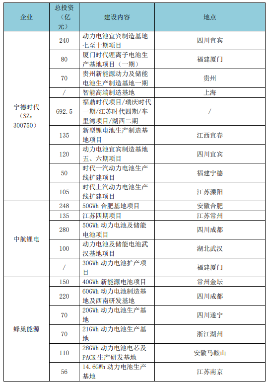 表2 2021年動(dòng)力及儲(chǔ)能電池?cái)U(kuò)產(chǎn)十大企業(yè)