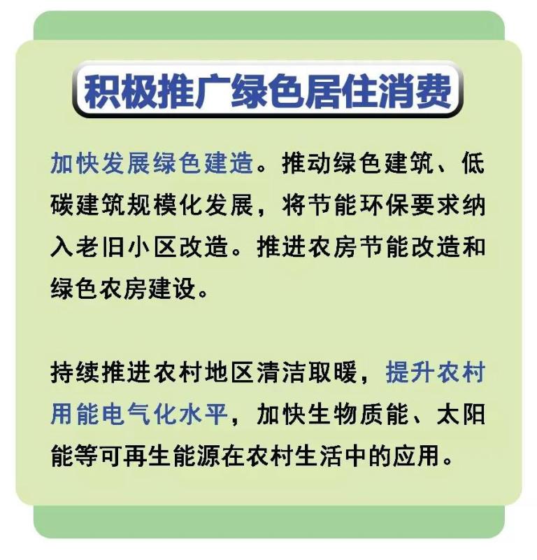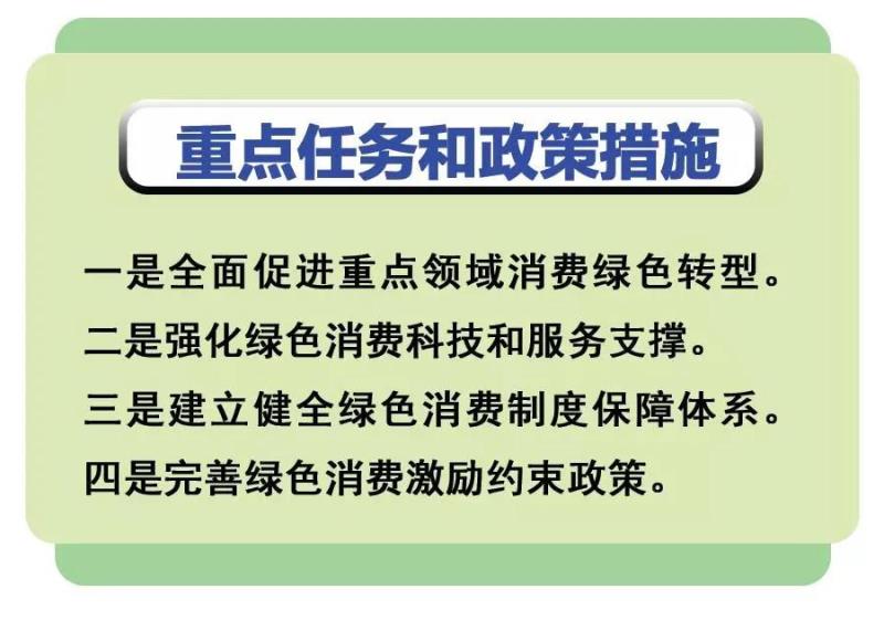 《實(shí)施方案》按照目標(biāo)導(dǎo)向和問題導(dǎo)向的要求,對(duì)促進(jìn)綠色消費(fèi)的制度政策體系進(jìn)行了系統(tǒng)設(shè)計(jì),提出四個(gè)方面的重點(diǎn)任務(wù)和政策措施。一是全面促進(jìn)重點(diǎn)領(lǐng)域消費(fèi)綠色轉(zhuǎn)型。加快提升食品消費(fèi)綠色化水平,鼓勵(lì)推行綠色衣著消費(fèi),積極推廣綠色居住消費(fèi),大力發(fā)展綠色交通消費(fèi),全面促進(jìn)綠色用品消費(fèi),有序引導(dǎo)文化和旅游領(lǐng)域綠色消費(fèi),進(jìn)一步激發(fā)全社會(huì)綠色電力消費(fèi)潛力,大力推進(jìn)公共機(jī)構(gòu)消費(fèi)綠色轉(zhuǎn)型。二是強(qiáng)化綠色消費(fèi)科技和服務(wù)支撐。推廣應(yīng)用先進(jìn)綠色低碳技術(shù),推動(dòng)產(chǎn)供銷全鏈條銜接暢通,加快發(fā)展綠色物流配送,拓寬閑置資源共享利用和二手交易渠道,構(gòu)建廢舊物資循環(huán)利用體系。三是建立健全綠色消費(fèi)制度保障體系。加快健全法律制度,優(yōu)化完善標(biāo)準(zhǔn)認(rèn)證體系,探索建立統(tǒng)計(jì)監(jiān)測(cè)評(píng)價(jià)體系,推動(dòng)建立綠色消費(fèi)信息平臺(tái)。四是完善綠色消費(fèi)激勵(lì)約束政策。增強(qiáng)財(cái)政支持精準(zhǔn)性,加大金融支持力度,充分發(fā)揮價(jià)格機(jī)制作用,推廣更多市場(chǎng)化激勵(lì)措施,強(qiáng)化對(duì)違法違規(guī)等行為處罰約束。