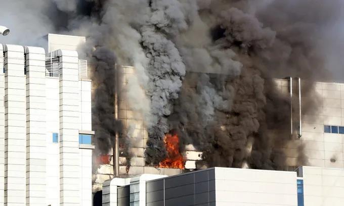 現(xiàn)場畫面顯示,該汽車電池工廠占地較大,火勢從工廠高層傳出,蔓延迅速?,F(xiàn)場曾傳出爆炸聲,從該工廠升起的巨大煙團(tuán)在遠(yuǎn)處依然清晰可見。在旁建筑也受到火勢波及,屋頂出現(xiàn)破損。