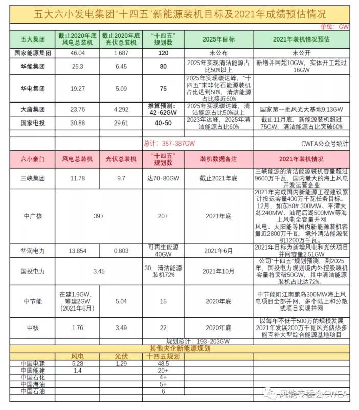 2、華能集團:2021年12月29日,華能集團宣布2021年新能源新增并網(wǎng)超10GW、實體開工超16GW。華能明顯在2021年一體化大基地項目簽約項目超100GW?!笆奈濉蹦繕朔矫妫?021年初華能集團規(guī)劃到2025年確保清潔能源裝機占比50%以上,預計“十四五”期間新增新能源裝機80GW以上。