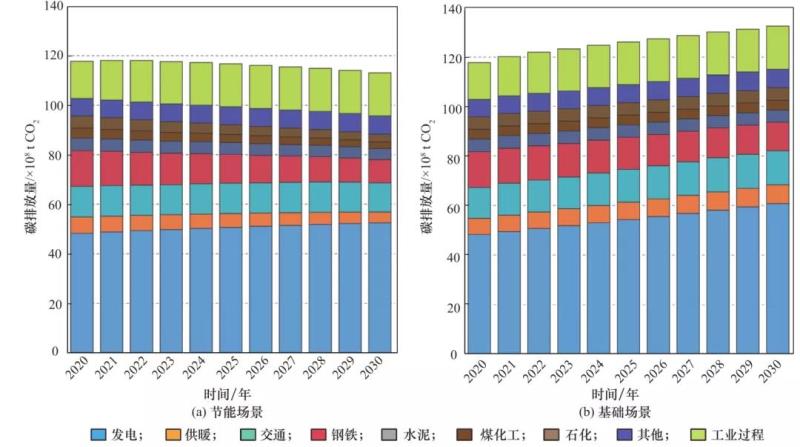 在建立節(jié)能分析模型的基礎上,通過各種活動的碳排放因子估算兩種場景下的碳排放情況,進而評估實施節(jié)能措施下的碳減排效果。本文僅計算能源和工業(yè)活動中產(chǎn)生的碳排放,不考慮碳匯和碳移除技術的作用。在基礎場景下,碳排放總量雖呈現(xiàn)增長逐步放緩的趨勢,但在2030年前仍不能順利實現(xiàn)達峰;而在節(jié)能場景下,碳排放將很快進入平臺期并在2026年前后開始穩(wěn)步下降。預計到2030年,在實施節(jié)能措施后,可減少碳排放量約1.95×109 tCO2,2021—2030年將累計減少碳排放量約為1.05×1010 tCO2,相當于2020年我國能源活動的碳排放總量(見圖8)。因此,強化節(jié)能措施可以有效降低未來能源消費需求并顯著降低碳排放總量,從而成為推動我國碳達峰、碳中和目標實現(xiàn)的重要手段。