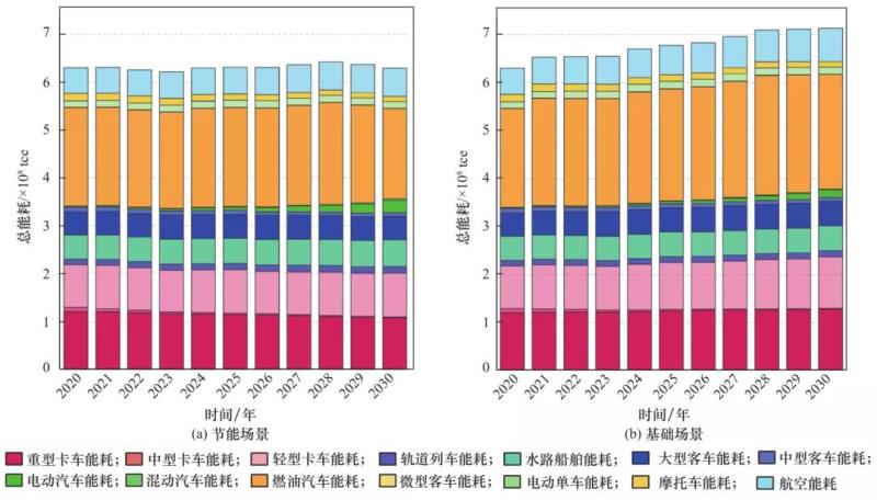 交通領域節(jié)能潛力分析模型主要涉及客運和貨運兩大類,其中公路交通因能源消費占比較高是重點節(jié)能部門。預計到2030年,在節(jié)能場景下我國公路客運節(jié)能潛力約為4.35×107 tce,主要來自于新能源汽車對燃油汽車的替代;通過綜合運用“公轉鐵”“公轉水”、多式聯(lián)運、發(fā)動機能效水平提升等手段,公路貨運的節(jié)能潛力約為3.7×107 tce,水路和鐵路貨運交通能耗則上升至7.8×106 tce,航空運輸通過提升發(fā)動機能效可實現(xiàn)節(jié)能約1×107 tce。