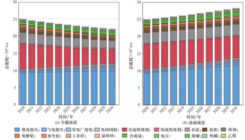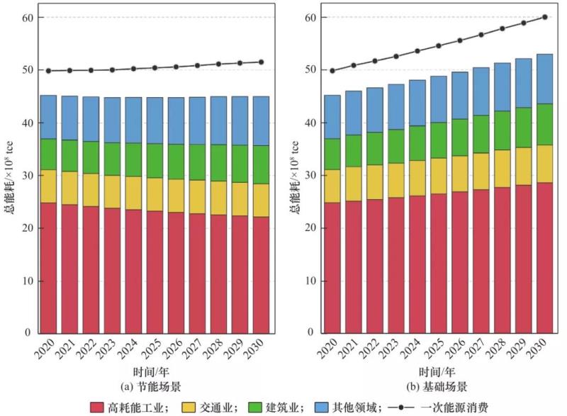 綜上,我國高耗能工業(yè)領域在2030年可實現(xiàn)節(jié)能約6×108 tce,相當于2019年該領域能源消費總量的24.5%;2021—2030年累計節(jié)能約3.37×109 tce,節(jié)能潛力貢獻主要來自于鋼鐵和電力部門。在基礎場景下工業(yè)領域總能源消費呈持續(xù)上升趨勢,而采取節(jié)能措施后可實現(xiàn)總體能源消費的逐步下降。
