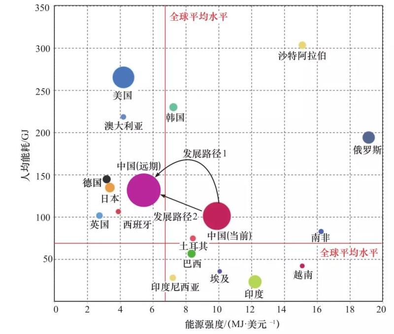 圖 1 2020 年部分國家能源消費現(xiàn)狀及我國節(jié)能措施下能源發(fā)展路徑