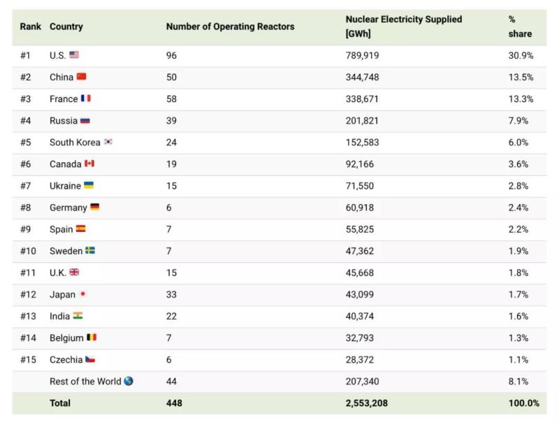 從核電占發(fā)電比例來(lái)看,各國(guó)排名如下: