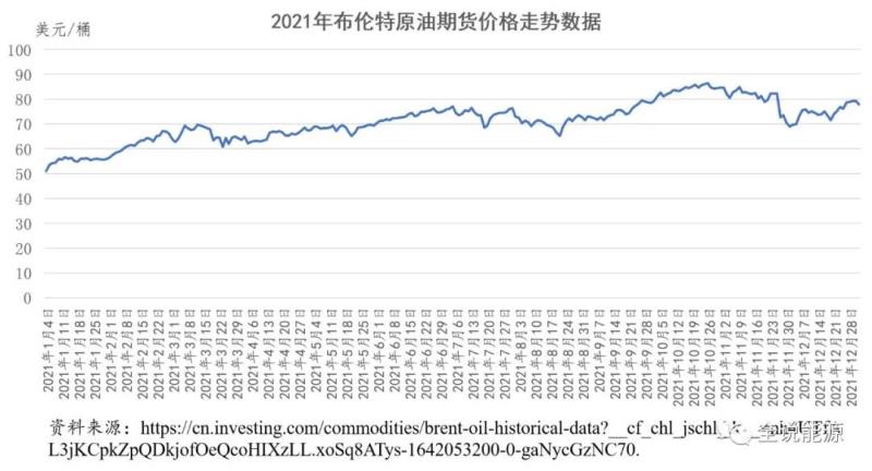 相比于天然氣和煤炭,作為大宗商品之王的原油,2021年的表現(xiàn)顯得非常溫和。1月4日,布倫特原油期貨以每桶51.50美元開(kāi)盤(pán),12月31日以每桶77.78美元收盤(pán),2021年每桶上漲了26.28美元,上漲了1.51倍;布倫特原油的最高價(jià),出現(xiàn)在2021年10月25日,為86.70美元/桶,比1月4日的開(kāi)盤(pán)價(jià)上漲了35.2美元,上漲了1.68倍;高低價(jià)出現(xiàn)在1月4日,為每桶50.56美元,高低價(jià)差為每桶36.14美元。2021年,布倫特原油期貨均價(jià)為每桶70.95美元。