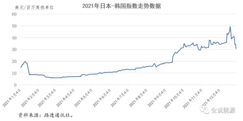 日韓指數(shù)2021年均價(jià)為每百萬(wàn)英熱單位18美元。1月4日,日韓指數(shù)的開(kāi)盤(pán)價(jià)為每百萬(wàn)英熱單位14.93美元,12月31日的收盤(pán)價(jià)為30.50美元,2021年日韓指數(shù)上漲了15.57美元,上漲了2.04倍;以12月21日的最高價(jià)計(jì)算,日韓指數(shù)上漲了34.42美元,上漲了3.3倍。以2月25日的每百萬(wàn)英熱單位5.81美元的最低價(jià)計(jì)算,高低價(jià)差達(dá)43.54美元。