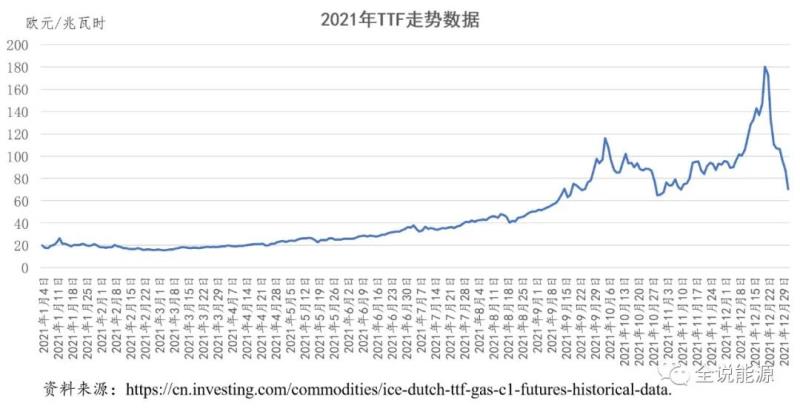 從2021年全年看,TTF的均價(jià)為47.846歐元/兆瓦時(shí),最高價(jià)是12月21日出現(xiàn)的,為187.785歐元/兆瓦時(shí),最低價(jià)出現(xiàn)在3月3日,為15.485歐元/兆瓦時(shí),高低價(jià)差為172.3歐元/兆瓦時(shí);1月4日,TTF的開(kāi)盤(pán)價(jià)為19.20歐元/兆瓦,2021年TTF最高價(jià)上漲了9.78倍;以12月31日70.340歐元/兆瓦時(shí)的收盤(pán)價(jià)計(jì)算,2021年全年TTF上漲了51.24歐元/兆瓦時(shí),上漲了3.66倍。