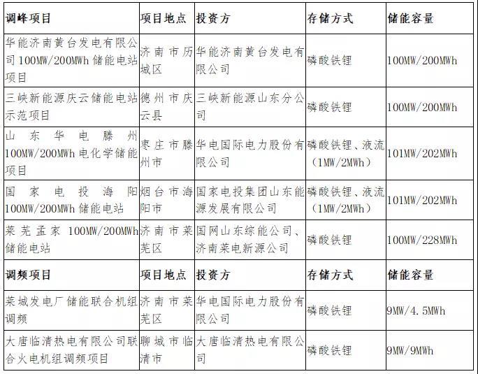山東省在全國(guó)率先發(fā)布了省級(jí)儲(chǔ)能指導(dǎo)意見《關(guān)于開展儲(chǔ)能示范應(yīng)用的實(shí)施意見》,在實(shí)施意見中發(fā)布了儲(chǔ)能參與輔助服務(wù)、租賃給新能源場(chǎng)站、獎(jiǎng)勵(lì)優(yōu)先發(fā)電量計(jì)劃的組合政策,確定了充放電量損耗部分按工商業(yè)及其他用電單一制電價(jià)結(jié)算的方式,初步建立了盈利模式,由此帶動(dòng)了示范項(xiàng)目的建設(shè)。首批五加二示范項(xiàng)目如下表: