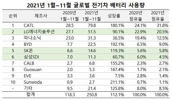 比如2021年5月份,SNE Research的單月戰(zhàn)報中,LG新能源其實就曾經(jīng)短暫超越過寧德時代。不過在當時那份報告口徑中,其只統(tǒng)計了“小型乘用車”項目,并沒有將寧德時代比較強勢的卡車、巴士算入其中。