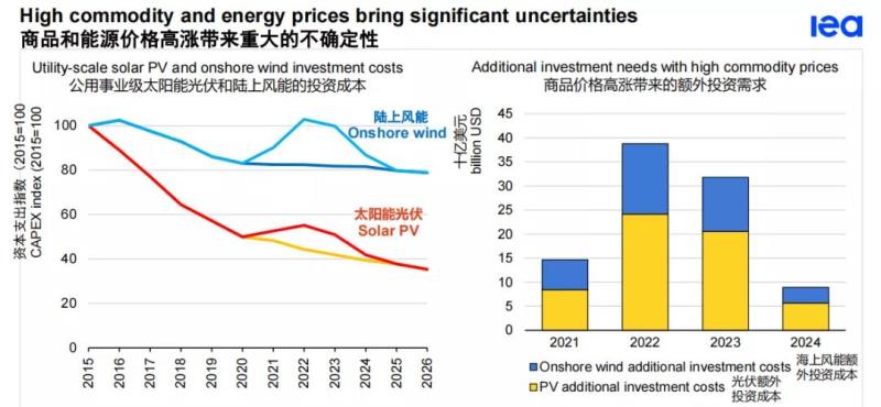 太陽(yáng)能光伏發(fā)電站和風(fēng)力發(fā)電站的較高價(jià)格對(duì)預(yù)期設(shè)備價(jià)格會(huì)持續(xù)下降的贏得競(jìng)爭(zhēng)性拍賣(mài)的開(kāi)發(fā)商構(gòu)成了特別的挑戰(zhàn)。如果商品價(jià)格在2022年之前一直居高不下,那么太陽(yáng)能三年和風(fēng)能五年的成本降低就會(huì)被抹去。增加的成本將需要超過(guò)1000億美元的額外投資來(lái)安裝相同數(shù)量的容量。 這相當(dāng)于將今天的全球可再生能源發(fā)電能力的年度投資增加約1/3。