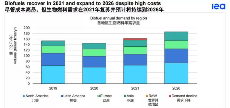 隨著印度和印度尼西亞引領(lǐng)全球生物燃料需求的重新增長(zhǎng),亞洲將超越歐洲。繼去年在全球運(yùn)輸中斷的情況下出現(xiàn)歷史性下降后,生物燃料的總需求將在2021年超過(guò)2019年的水平。在我們的主要情形中,全球?qū)ι锶剂系哪晷枨蟮?026年將增長(zhǎng)28%,達(dá)到1860億升。美國(guó)的產(chǎn)量增長(zhǎng)領(lǐng)先,但這一增長(zhǎng)大部分是從疫情造成的下降中反彈而來(lái)的。