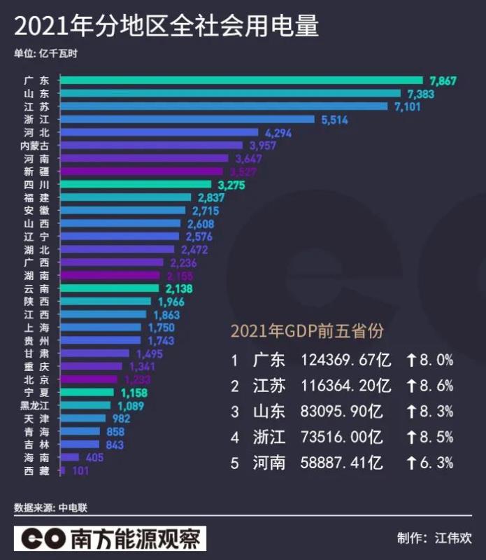 補充:由于2021年全國各省區(qū)GDP正在陸續(xù)公布中,因此上面GDP與用電量對比視頻中的數(shù)據(jù)只統(tǒng)計到2020年。2021年全國各省用電量數(shù)據(jù)及與已公開GDP數(shù)據(jù)前5名省區(qū)的對比(不含港澳臺),見下圖: