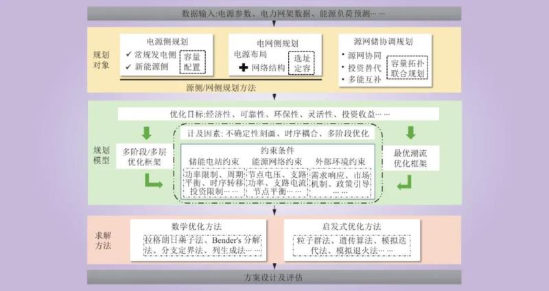 在大規(guī)模新能源接入的背景下,儲能規(guī)劃實現(xiàn)了儲能設(shè)備及其他系統(tǒng)元件的精細(xì)化建模,使得對物理系統(tǒng)特性的刻畫更能貼合實際,從而更為切實地制定了儲能配置需求,提升了資源的配置效率。本文將從電源側(cè)儲能規(guī)劃以及電網(wǎng)側(cè)儲能規(guī)劃兩類分別進(jìn)行闡述。