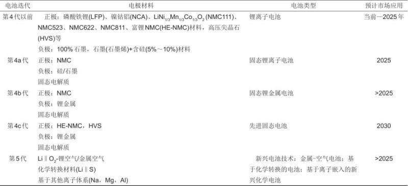 電化學(xué)儲(chǔ)能技術(shù)的發(fā)展歷程(圖1)最早起于1800年的伏打(Volta)電池和1836年的丹尼爾(Daniell)電池(也稱為鋅銅電池)。隨后,鉛/酸電池(1882年)、鎳/氫電池(1970年)和鋰電池(1990年)不斷涌現(xiàn),實(shí)現(xiàn)商業(yè)化應(yīng)用。但隨著電氣化、電網(wǎng)等大型應(yīng)用的發(fā)展,現(xiàn)已商業(yè)化的鋰離子電池一般采用有機(jī)電解液作為電解質(zhì),該電池存在漏液和易燃易爆問題,且在高溫、大電流工作時(shí)鋰金屬負(fù)極在循環(huán)過程中易生成鋰枝晶造成電池短路,當(dāng)其用于大容量存儲(chǔ)時(shí)具有較大的安全隱患。此外,為解決電動(dòng)汽車中退役的電池組回收利用問題,提出鋰離子電池梯次利用方案,即將報(bào)廢的車用鋰離子電池降級(jí)使用,繼續(xù)發(fā)揮余熱,但該方案具有較高的隱形成本以及再次降級(jí)應(yīng)用時(shí)與新儲(chǔ)能場(chǎng)景不適配的問題。因此,目前商業(yè)化的鋰離子已不能完全滿足現(xiàn)階段能量存儲(chǔ)所要求的性能、成本和其他擴(kuò)展目標(biāo)。針對(duì)移動(dòng)式儲(chǔ)能和中大型儲(chǔ)能應(yīng)用領(lǐng)域,研發(fā)“下一代電池”技術(shù)以提高電池安全性、增加電池能量密度,并進(jìn)一步降低制造成本以及對(duì)環(huán)境友好顯得尤為重要。根據(jù)歐盟2020年12月最新頒布的電池技術(shù)分類(表1),電化學(xué)儲(chǔ)能技術(shù)正逐步從鋰離子電池(第4代以前)朝向下一代電池技術(shù)(第4代之后)發(fā)展,主要包括:固態(tài)鋰電池、鈉離子電池、鉀離子電池、鋅離子電池、全固態(tài)電池、多價(jià)離子電池和金屬-空氣電池等技術(shù)領(lǐng)域,并有望于2025年以后實(shí)現(xiàn)市場(chǎng)化應(yīng)用。