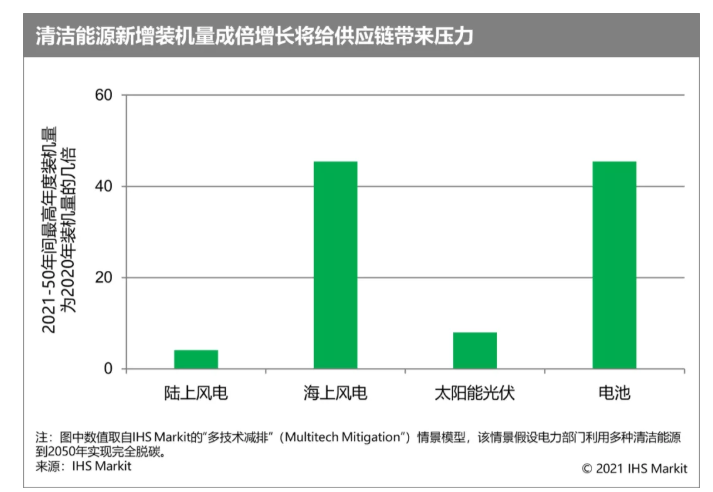 如若電力部門真能引領(lǐng)一場全面的全球能源轉(zhuǎn)型,那么根據(jù)埃信華邁(IHS Markit)提出的其中一個深度脫碳情景,2021-2050年間全球可能需要增加約280億千瓦的清潔發(fā)電能力,也就是年均新增清潔發(fā)電容量要比過去10年的年均水平高出5.5倍,實現(xiàn)這一目標所需的總投資額約為30-40萬億美元。