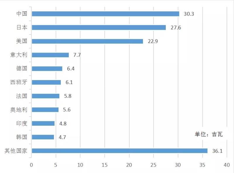 國際水電協(xié)會(IHA)數據顯示,截至2019年底,全球抽水蓄能總裝機容量接近160吉瓦,占全球儲能裝機容量的94%以上,占電網級儲能的96%以上。大部分抽水蓄能設施在歐洲和亞洲運營。其中,中國抽水蓄能裝機規(guī)模占世界總量的19%,居世界第一,其次是日本和美國(見圖2)。