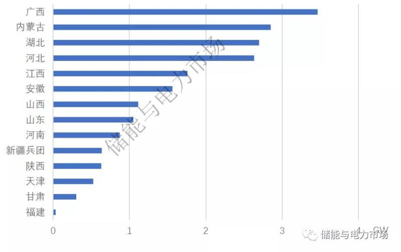 上述20.1GW/38.5GWh的儲(chǔ)能配置容量來(lái)自14個(gè)省市自治區(qū),其中:廣西、內(nèi)蒙古、湖北、河北的儲(chǔ)能配置總規(guī)模均超過(guò)了2GW。青海的市場(chǎng)化項(xiàng)目配置的儲(chǔ)能規(guī)模超過(guò)5GW,但因?yàn)樯形刺岢雒鞔_的并網(wǎng)時(shí)間要求,因此暫未計(jì)入。