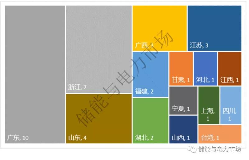 據(jù)儲能與電力市場統(tǒng)計,2021年,新增項目(規(guī)劃、建設(shè)、投運)涵蓋廣東、江蘇、浙江、福建等15個省市,涉及近40個項目。