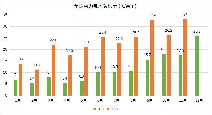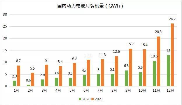 中國儲能網(wǎng)訊:2021年,我國動力電池裝機(jī)量154.5GWh,同比增長142.8%。其中12月份裝機(jī)量達(dá)到26.2GWh,創(chuàng)歷史新高,同比增長102.4%。