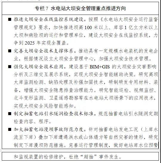 強(qiáng)化水電站大壩安全保障。完善大壩安全法律法規(guī)及技術(shù)標(biāo)準(zhǔn)體系,推動(dòng)大壩安全領(lǐng)域風(fēng)險(xiǎn)分級(jí)管控和隱患排查治理雙重預(yù)防機(jī)制建設(shè),提高水電站大壩運(yùn)行安全風(fēng)險(xiǎn)管控水平。加強(qiáng)電力企業(yè)隱患自查自改自報(bào)的規(guī)范管理。進(jìn)一步加強(qiáng)電力企業(yè)大壩安全應(yīng)急管理,不斷完善以大壩安全應(yīng)急預(yù)案建設(shè)為重點(diǎn)的電力企業(yè)突發(fā)事件預(yù)防與應(yīng)急準(zhǔn)備。進(jìn)一步發(fā)揮科技引領(lǐng)作用,加大創(chuàng)新力度,推動(dòng)北斗系統(tǒng)、智能大壩等新技術(shù)研發(fā)和推廣應(yīng)用,促進(jìn)水電站大壩安全管理新技術(shù)的應(yīng)用。