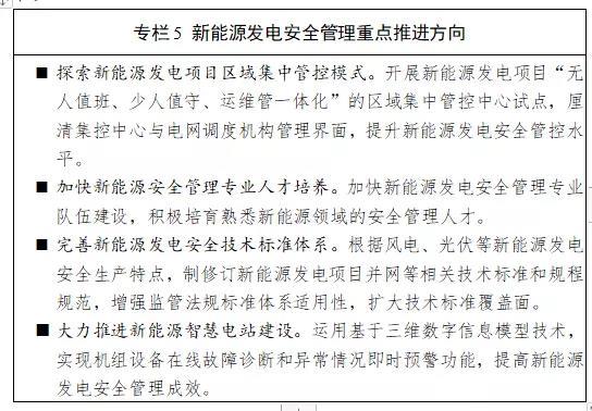 強(qiáng)化新能源發(fā)展安全保障。積極探索新能源發(fā)電安全管理新思路,厘清安全責(zé)任界面,創(chuàng)新安全管理模式和技術(shù)措施,加強(qiáng)新能源開(kāi)發(fā),特別是以沙漠、戈壁、荒漠地區(qū)為重點(diǎn)的大型風(fēng)電、光伏基地項(xiàng)目的安全風(fēng)險(xiǎn)評(píng)估和管控。完善新能源發(fā)電安全技術(shù)標(biāo)準(zhǔn)體系,加強(qiáng)新能源和儲(chǔ)能電站發(fā)電并網(wǎng)安全管理,強(qiáng)化抽水蓄能電站建設(shè)運(yùn)行安全監(jiān)管,提升新能源發(fā)電運(yùn)行安全水平。