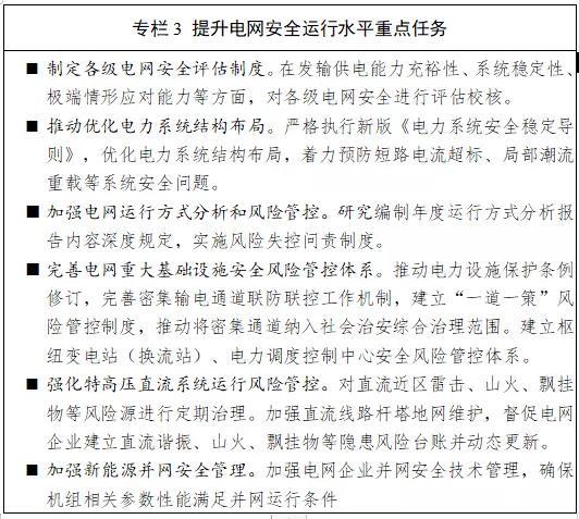 加強(qiáng)電網(wǎng)安全運(yùn)行管理。推動(dòng)優(yōu)化電力系統(tǒng)結(jié)構(gòu)布局,有效控制并逐步化解電力系統(tǒng)重大結(jié)構(gòu)性風(fēng)險(xiǎn),強(qiáng)化分層分區(qū)運(yùn)行能力。加強(qiáng)電力設(shè)施保護(hù),常態(tài)化開(kāi)展樞紐變電站、重要換流站、主干電網(wǎng)和重要輸電通道動(dòng)態(tài)風(fēng)險(xiǎn)評(píng)估,優(yōu)化電力設(shè)施運(yùn)行環(huán)境,提升防外力破壞監(jiān)測(cè)能力。加強(qiáng)涉網(wǎng)安全管理,做深做細(xì)年度運(yùn)行方式分析,完善常態(tài)化電網(wǎng)安全風(fēng)險(xiǎn)管控工作機(jī)制。強(qiáng)化新能源場(chǎng)站涉網(wǎng)安全管理,促進(jìn)廠網(wǎng)協(xié)調(diào)支撐,保障電力系統(tǒng)安全平穩(wěn)轉(zhuǎn)型。加強(qiáng)配電網(wǎng)和農(nóng)村電網(wǎng)升級(jí)改造的安全管理。