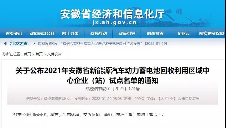 關(guān)于公布2021年安徽省新能源汽車動(dòng)力蓄電池回收利用區(qū)域中心企業(yè)(站)試點(diǎn)名單的通知