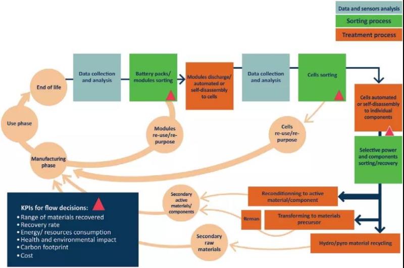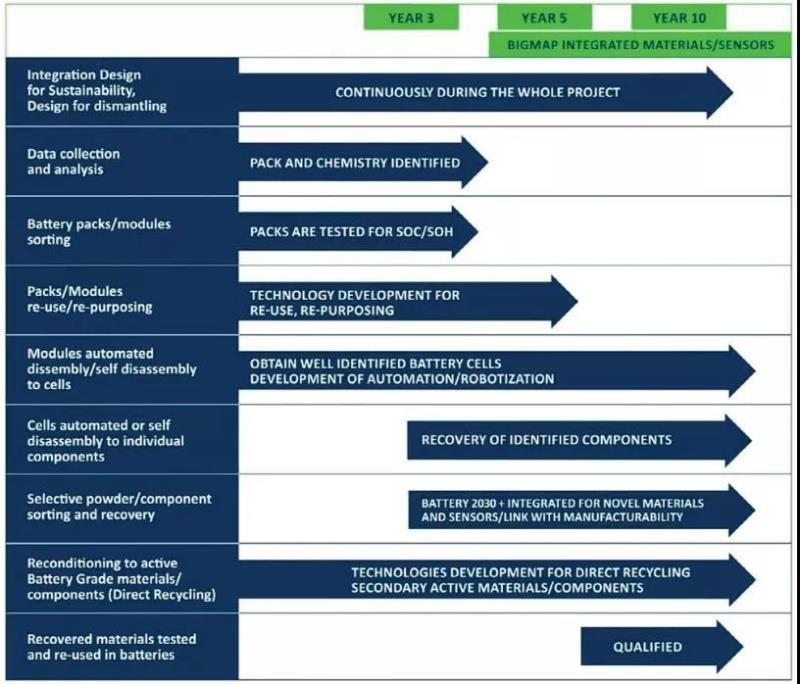 在短期內(nèi),開始整合可持續(xù)性和拆解設(shè)計(jì),開發(fā)數(shù)據(jù)收集和分析系統(tǒng),端到端可追溯性,開發(fā)電池組/模塊分揀和再利用/再利用技術(shù),并開始開發(fā)電池單元的自動拆解。開發(fā)用于快速電池表征的新測試。