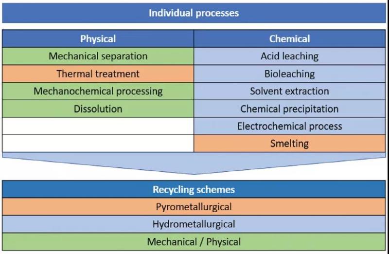 目前,火法冶金是應(yīng)用最多的方法。在根據(jù)電池化學(xué)成分進(jìn)行潛在的拆卸和分類后,電池或電池部件直接進(jìn)入回收過程或通過物理方式(例如,切碎或研磨)進(jìn)一步破碎。在回收方案方面,根據(jù)所選擇的電池化學(xué)和工藝,可能需要涉及物理、機(jī)械和/或化學(xué)轉(zhuǎn)化的幾個步驟。盡管每個回收商可能會使用不同的單獨(dú)步驟的變化或組合,但目前的回收過程(或方案)分類如圖 12 所示。