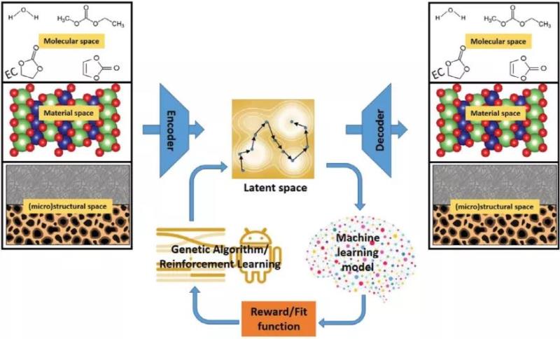 圖 5. 相間設(shè)計(jì)的生成模型?;谧兎肿詣泳幋a器 (VAE) 的電池界面化學(xué)和結(jié)構(gòu)信息的編碼和解碼到潛在空間,通過使用例如遺傳算法或基于強(qiáng)化學(xué)習(xí)的探索來實(shí)現(xiàn)生成電池界面設(shè)計(jì)。