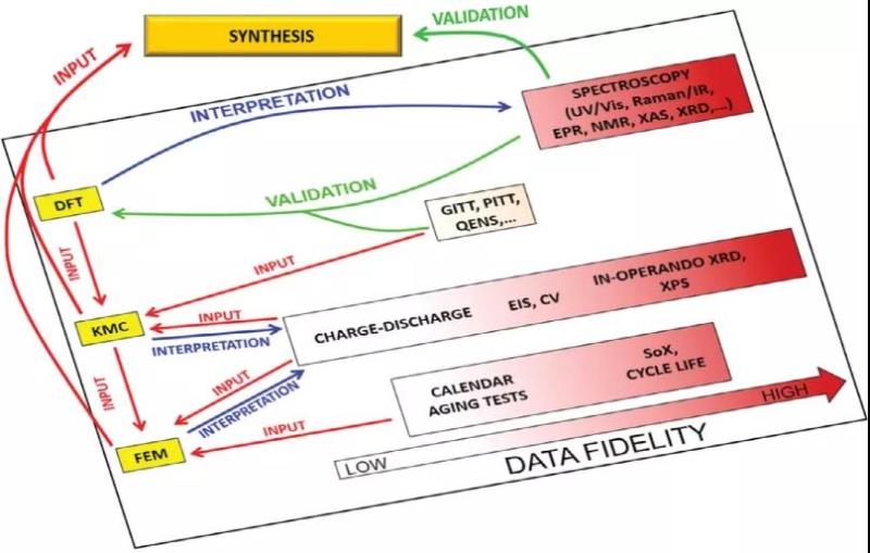 圖4. 研究電池接口的代表性實(shí)驗(yàn)方法和理論方法之間的數(shù)據(jù)流示意圖。每種方法的保真度通常與其成本成正比,但只有在給定的方法/數(shù)據(jù)最有價值時才能通過獲取數(shù)據(jù)來優(yōu)化保真度-成本關(guān)系。