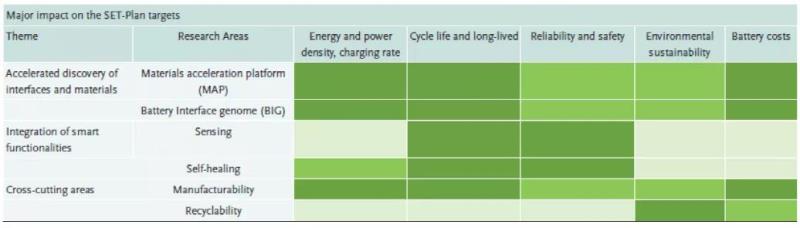 表1. BATTERY 2030+ 研究領(lǐng)域?qū)?SET 計(jì)劃目標(biāo)的影響,深綠色表示高影響,淺綠色表示中到低影響