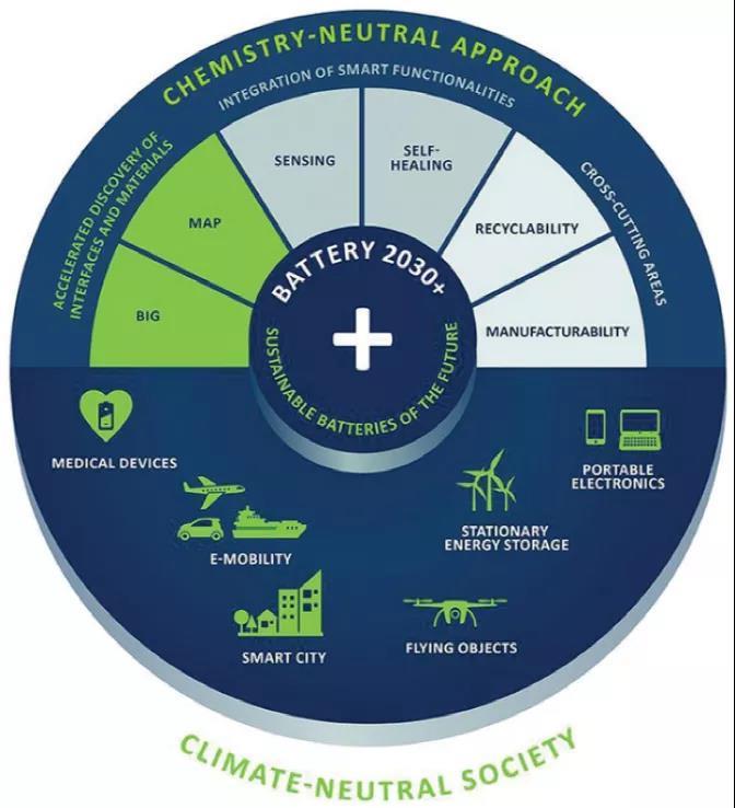 中國儲能網(wǎng)訊:可充電電池是一項(xiàng)關(guān)鍵技術(shù),可為大量電子儀器、設(shè)備和交通工具提供能量存儲。電池可以加速向可持續(xù)和智能移動的轉(zhuǎn)變,幫助提供清潔、安全的能源,并向碳中和社會過渡。歐盟委員會的目標(biāo)是2030 年將溫室氣體凈排放量減少至少 55%,其中要求電池具有超越當(dāng)前技術(shù)指標(biāo)的超高性能:能量和功率密度必須接近理論極限,必須實(shí)現(xiàn)出色的使用壽命和可靠性以及增強(qiáng)的安全性和環(huán)境可持續(xù)性。此外,為了在商業(yè)上取得成功,新的電池技術(shù)必須具有可擴(kuò)展性、可持續(xù)性,并能夠?qū)崿F(xiàn)具有成本效益的大規(guī)模生產(chǎn)。這些要求對電池研究界構(gòu)成了巨大的挑戰(zhàn),而 BATTERY 2030+ 是歐洲的大規(guī)模和長期研究計(jì)劃,為歐盟委員會提出的戰(zhàn)略能源技術(shù)計(jì)劃(SET-plan)的想法之一,旨在聯(lián)合歐洲整體解決未來電池研發(fā)過程中所面臨的各項(xiàng)挑戰(zhàn),克服重重阻力達(dá)成宏大的既定的電池性能目標(biāo)。