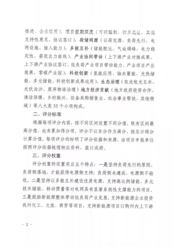 評(píng)分權(quán)重設(shè)置了五個(gè)突出點(diǎn),一是負(fù)荷先行,負(fù)荷側(cè)落地才能獲得電源側(cè)支持,負(fù)荷未建成則電源不驗(yàn)收;二是以多能互補(bǔ)建設(shè)優(yōu)質(zhì)電源;三是鼓勵(lì)新能源投資化工、文旅、商貿(mào)等項(xiàng)目,支持采購州內(nèi)產(chǎn)品;四是突出氫能和光熱應(yīng)用;五是支持新能源企業(yè)與政府投資公司深度合作,促進(jìn)建筑、服務(wù)、金融的發(fā)展。