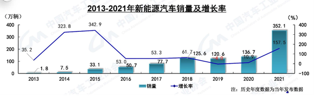 2021年,在全球疫情的影響下,我國新能源汽車產(chǎn)銷量依然呈爆發(fā)式增長。中汽協(xié)數(shù)據(jù)顯示,2021年,我國新能源汽車銷量352.1萬輛,同比增長1.6倍,連續(xù)7年位居全球第一,市場占有率達(dá)到13.4%,高于上年8個(gè)百分點(diǎn)。