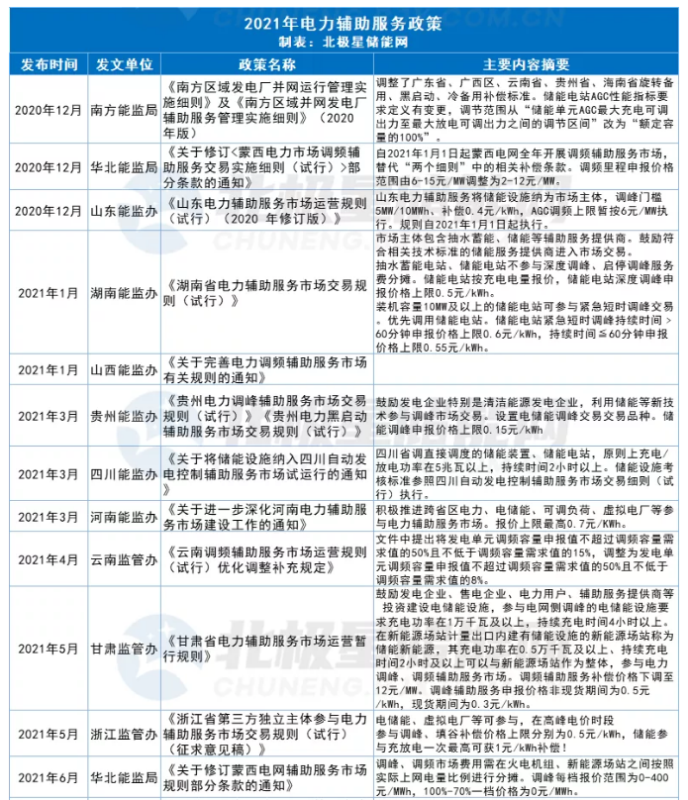 在雙碳戰(zhàn)略目標(biāo)下,能源清潔化是核心。2021年以來(lái)各地都陸續(xù)發(fā)布文件啟動(dòng)新能源“倍增計(jì)劃”,電源側(cè)多能互補(bǔ)、一體化、大基地模式成為新的發(fā)展趨勢(shì)。新能源發(fā)電的靠天吃飯?zhí)匦灾饾u成為其發(fā)展瓶頸,同時(shí)也是電源側(cè)儲(chǔ)能難以實(shí)現(xiàn)商業(yè)化的突破口。2021年全國(guó)各省市新能源配套儲(chǔ)能需求多達(dá)29項(xiàng),各地26項(xiàng)儲(chǔ)能主題文件中大多提及了鼓勵(lì)以共享或租賃形式建設(shè)儲(chǔ)能節(jié)約成本,但真正最有利的推手當(dāng)屬新版兩個(gè)細(xì)則。
