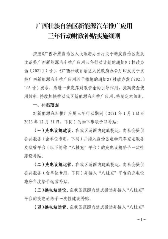 中國儲能網(wǎng)訊:1月30日,廣西壯族自治區(qū)發(fā)展和改革委員會等4部門印發(fā)關(guān)于《廣西壯族自治區(qū)新能源汽車推廣應(yīng)用三年行動財政補貼實施細則的通知》。文中對于充電設(shè)施、換電站、蓄電池回收補貼都有詳細介紹。