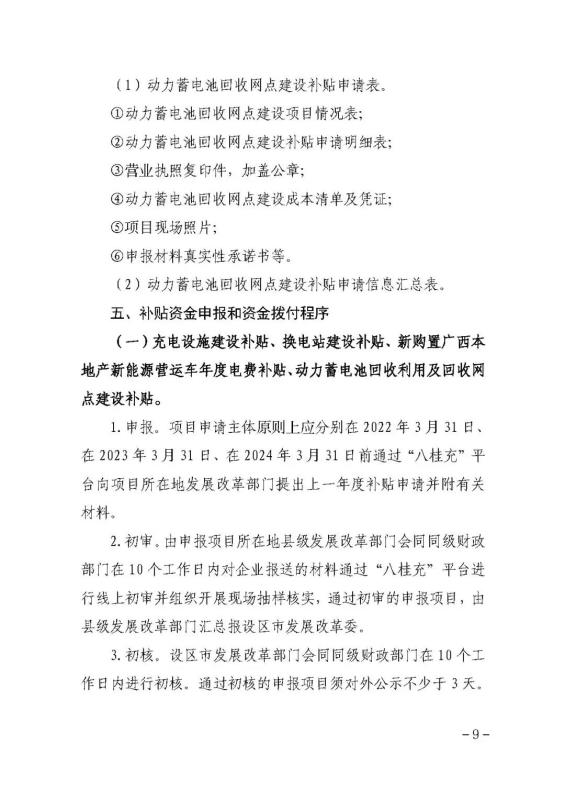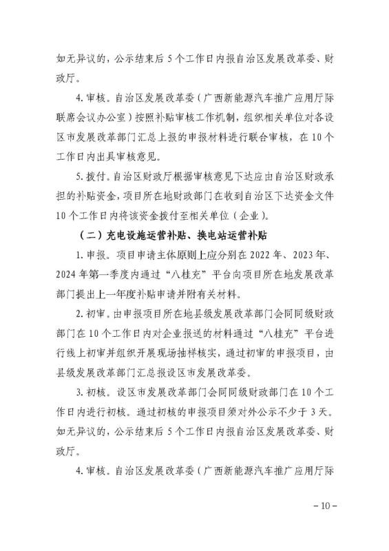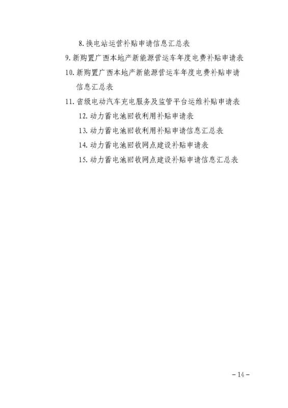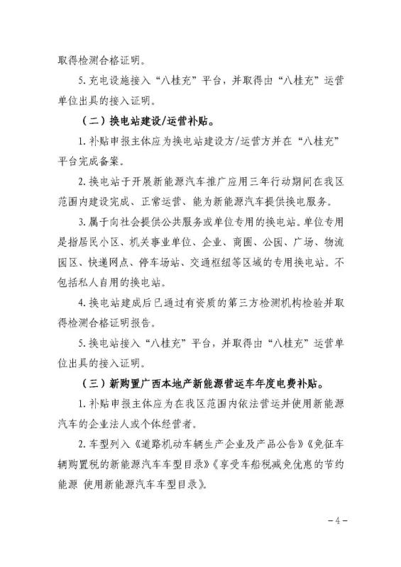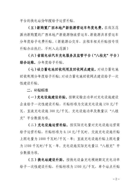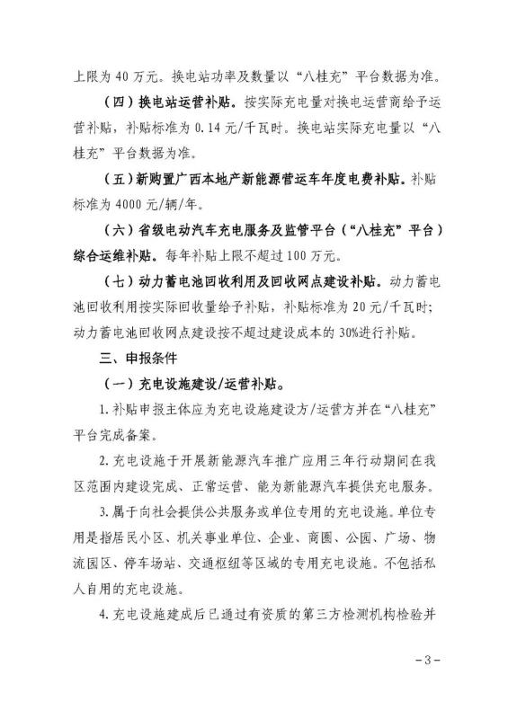 (四)換電站運營補貼。按實際充電量對換電運營商給予運營補貼,補貼標準為0.14元/千瓦時。換電站實際充電量以“八桂充”平臺數(shù)據(jù)為準。