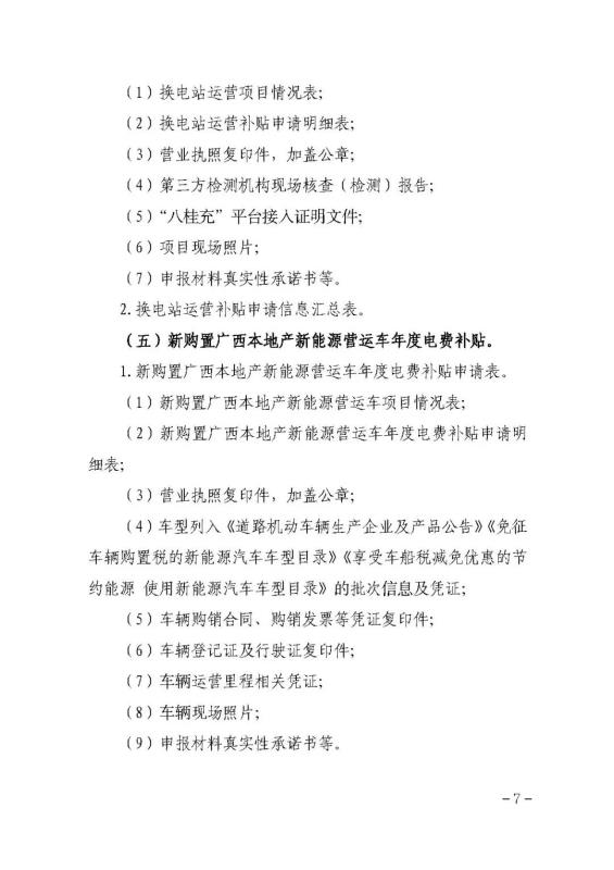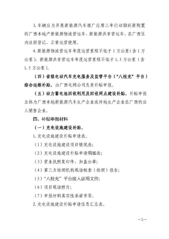 (五)新購置廣西本地產(chǎn)新能源營運車年度電費補貼。補貼標準為4000元/輛/年。