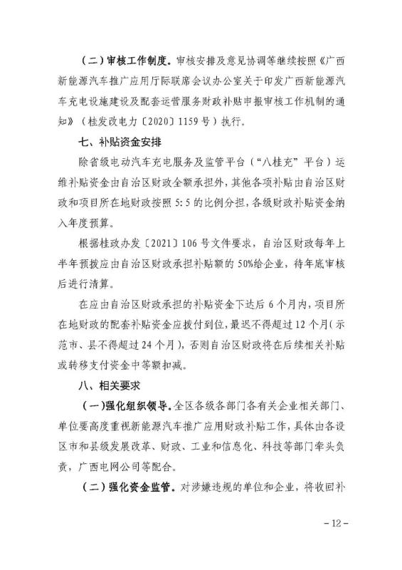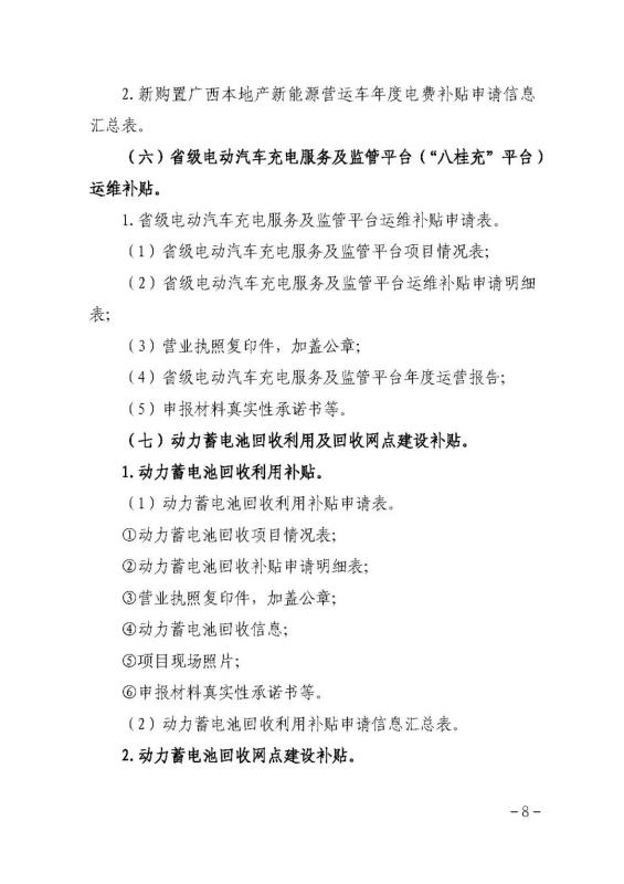 (六)省級電動汽車充電服務(wù)及監(jiān)管平臺(“八桂充”平臺)綜合運維補貼。每年補貼上限不超過100萬元。