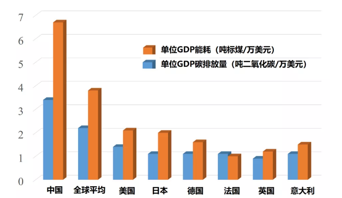 雖然我國(guó)歷史人均累計(jì)碳排放量遠(yuǎn)低于發(fā)達(dá)國(guó)家,但單位國(guó)內(nèi)生產(chǎn)總值(GDP)能耗與碳排放量遠(yuǎn)高于發(fā)達(dá)國(guó)家,如2020年我國(guó)單位GDP能耗為3.4噸標(biāo)準(zhǔn)煤/萬(wàn)美元,單位GDP碳排放量為6.7噸二氧化碳/萬(wàn)美元,均遠(yuǎn)高于全球平均水平及美國(guó)、日本、德國(guó)、法國(guó)、英國(guó)等發(fā)達(dá)國(guó)家(圖2)。