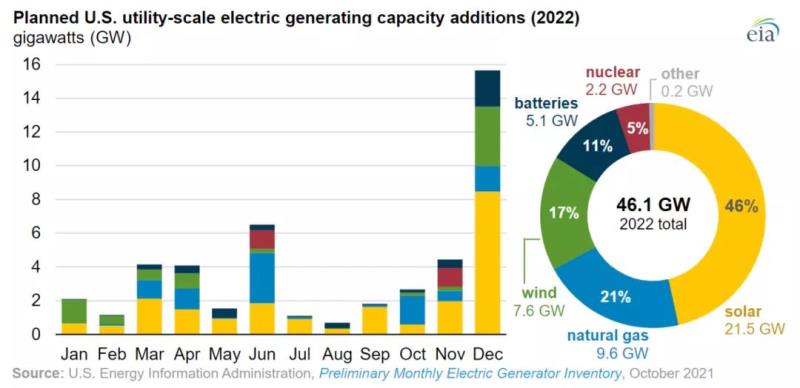 中國儲能網(wǎng)訊:據(jù)美國能源信息暑的預測,2022年美國電網(wǎng)將新增46.1 吉瓦的公用事業(yè)規(guī)模發(fā)電容量,其中約21.5 吉瓦(46%)來自太陽能項目,9.6 吉瓦(21%)來自天然氣項目,7.6 吉瓦(17%)來自風力發(fā)電項目;預計儲能項目將增加5.1 GW(11%)。此外,美國在2022年增加的電力容量中,另有5%將來自喬治亞州Vogtle核電站的兩個新建機組。
